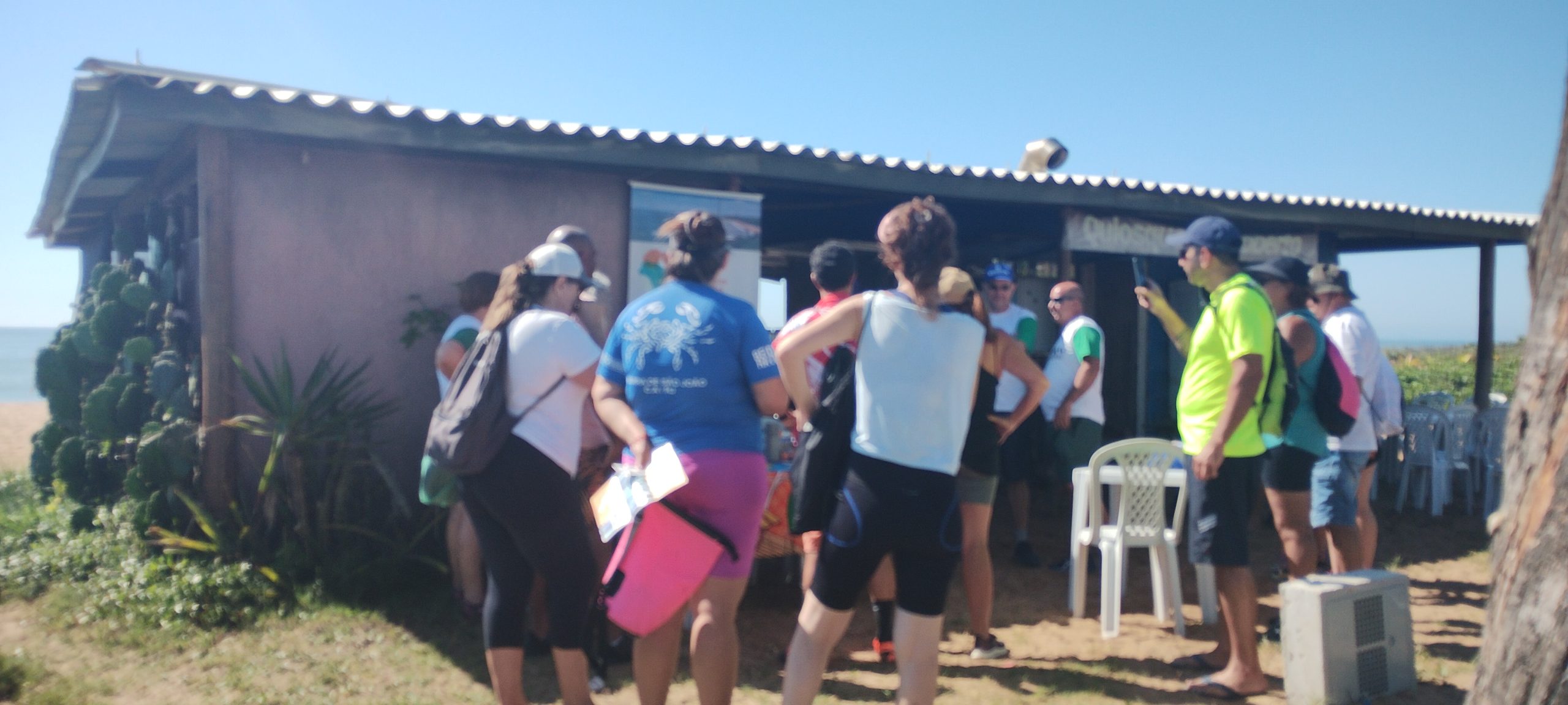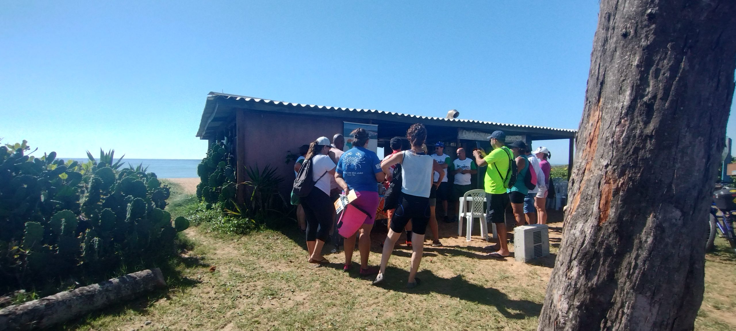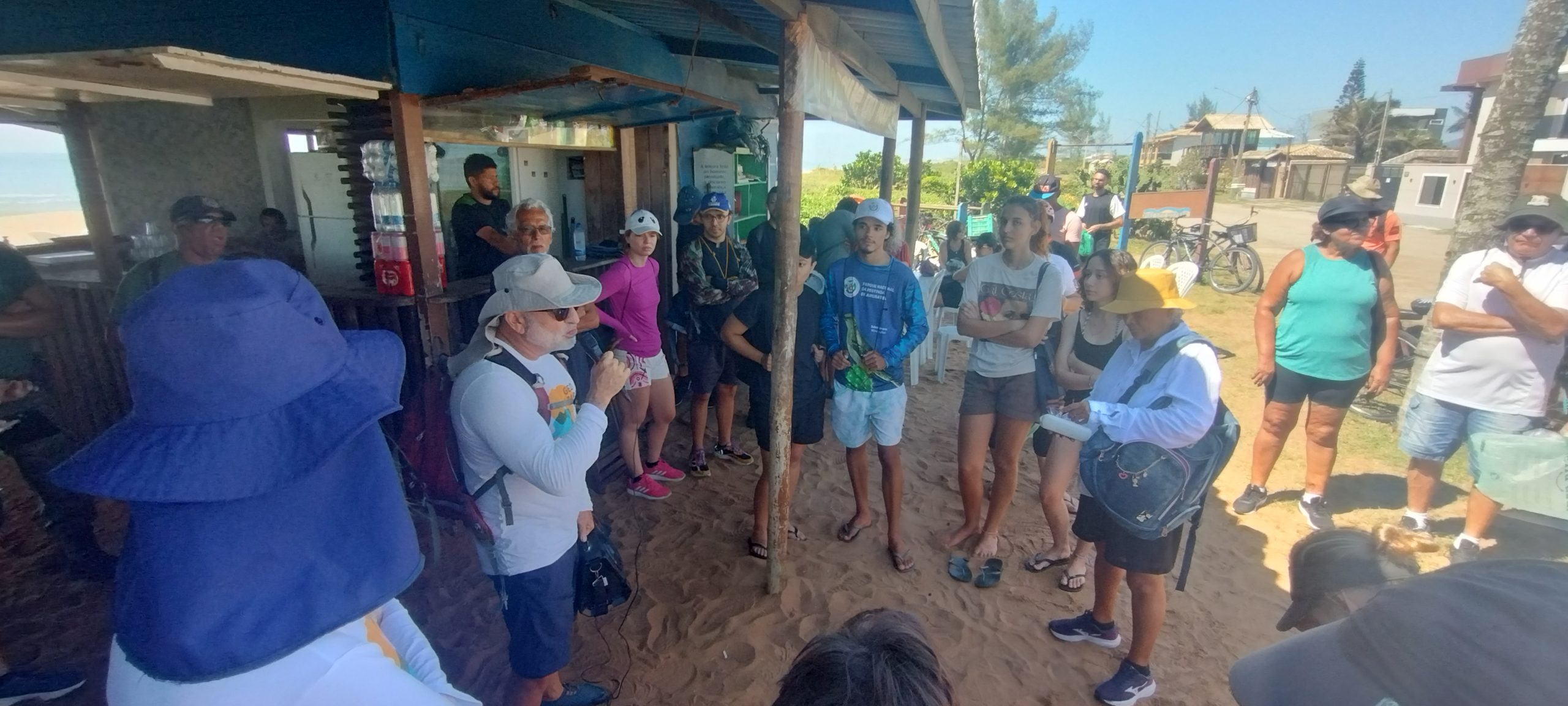 Iniciamos a atividade às 8:00h na margem da Lagoa Iriry antes da pedalada de 5 km em direção ao Quiosque do Roberto, na praia da Enseada das Gaivotas, onde os demais participantes estavam reunidos.