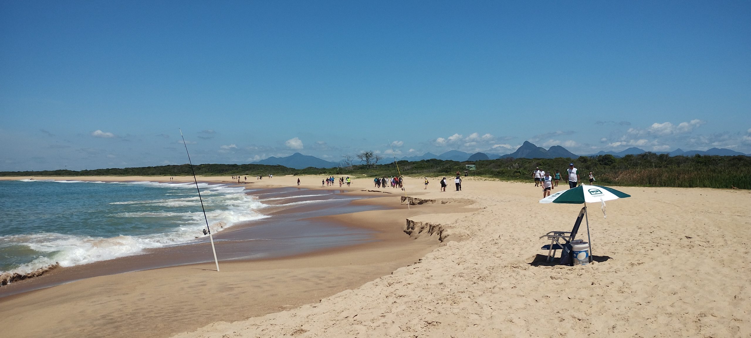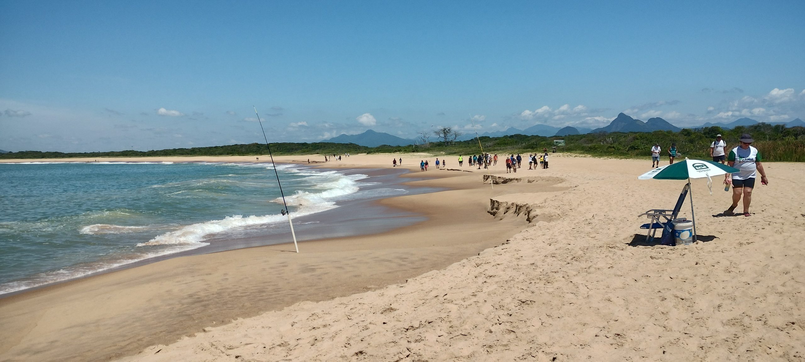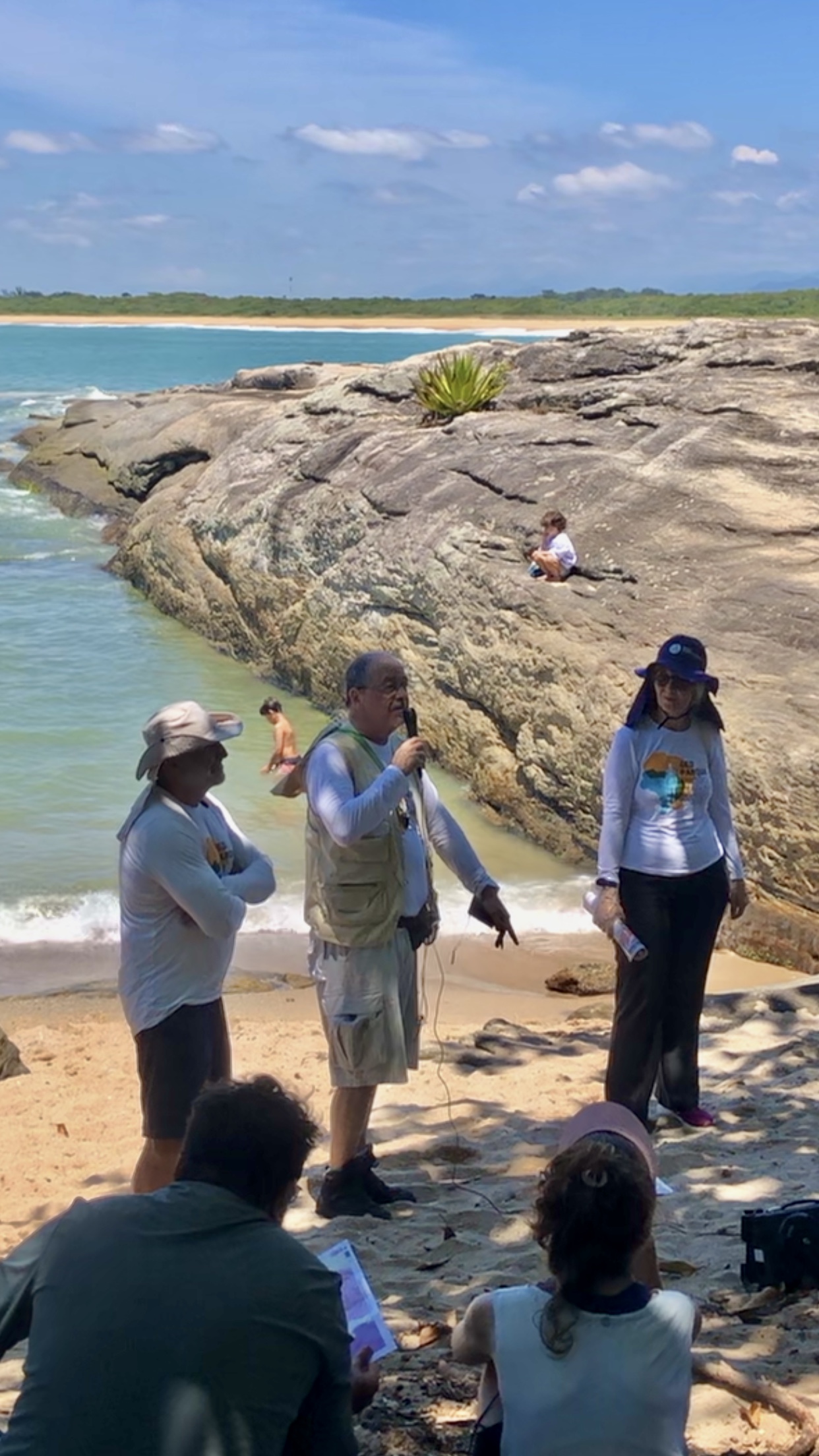 Assim se iniciou a caminhada pela praia da Reserva, de aproximadamente 2 km, até a praia da Fazenda com parada na Lagoa Salgada para observação e conversas sobre a formação da geodiversidade e o ecossistema local. No arco praial pudemos observar os sedimentos caracterizados por granulometria de areia grossa a muito grossa, evidenciando a alta energia e proximidade de sua área fonte.